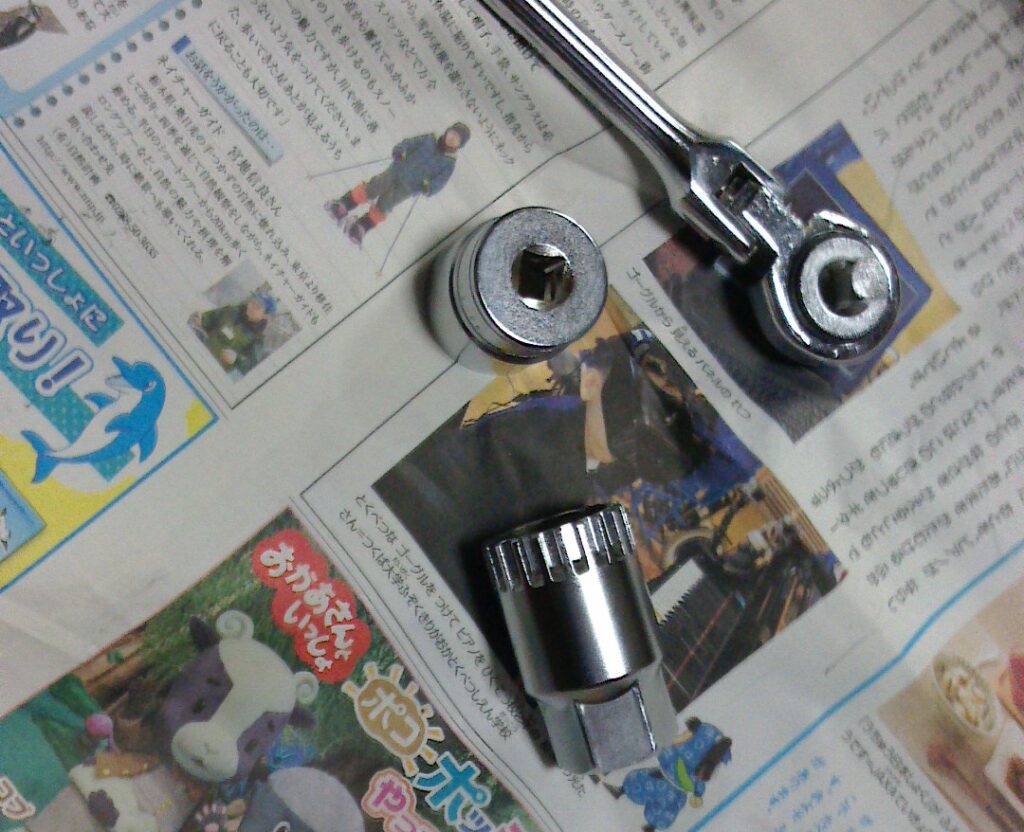 今回、我が家のラチェットクランクがサイズ適合しなかったので間に互換工具を使います。