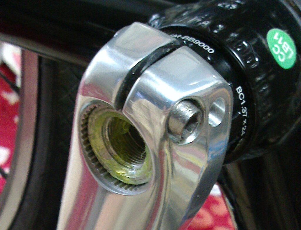 このようにコッタレスクランクを本来キャップがついていた溝にねじ込みます。